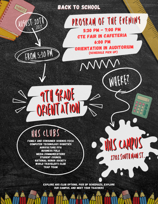 Join us for 9th Grade Orientation at Hope High School on August 10 from 5:30pm - 7:00pm! Students will get the schedules, learn where classes are, meet the teachers, and explore the various club options! There will be a CTE Fair in the Cafeteria at 6:00pm. Clubs available to students include: FAMILY AND CONSUMER SCIENCE/FCCA, COMPUTER TECHNOLOGY/ROBOTICS, AGRICULTURE/FFA, BUSINESS/FBLA, MEDIA COMMUNICATIONS, STUDENT COUNCIL, NATIONAL HONOR SOCIETY, WORLD TRAVELER'S CLUB, and TRAP TEAM!